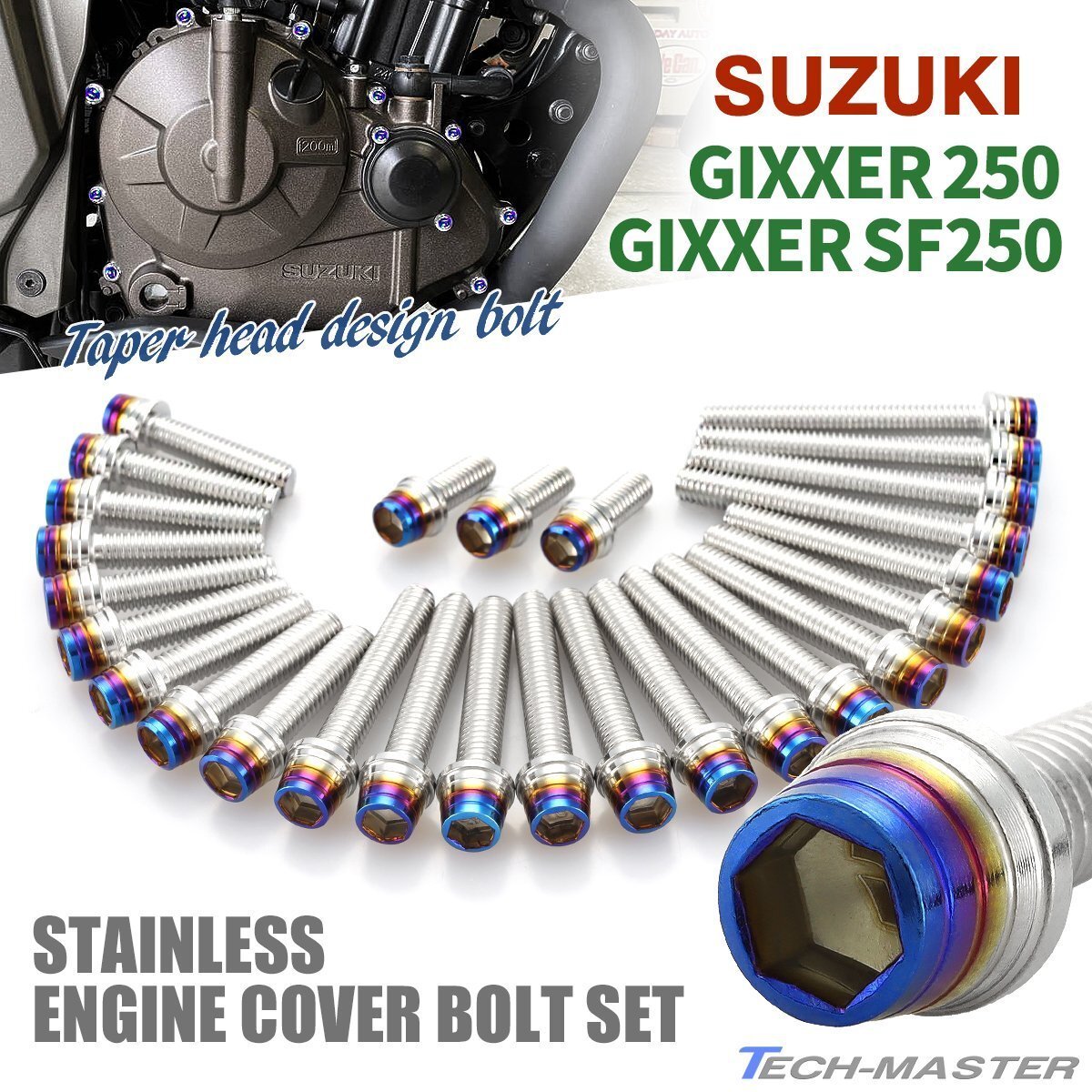 - ジクサー250/SF250 エンジンカバー クランクケース ボルト 27本セット ステンレス製 スズキ車用 シルバー×焼きチタンカラー TB9186