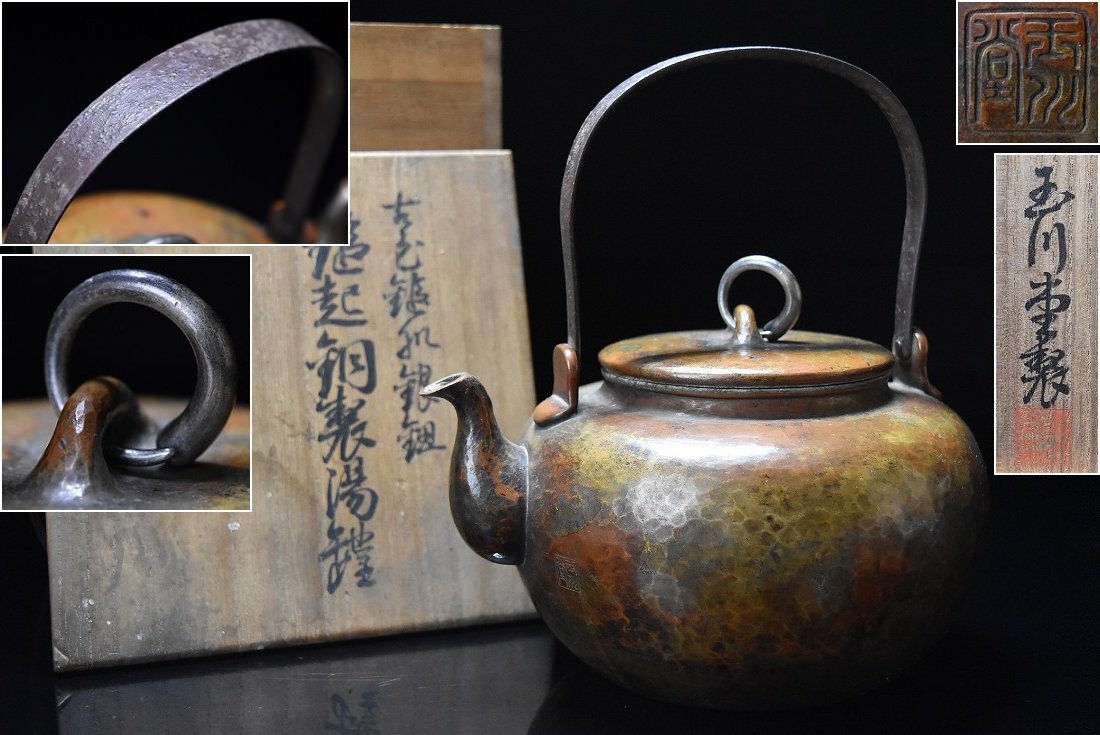 無形文化財 玉川堂造 古色鎚肌 銀環摘蓋 鉄平提手 銅瓶 湯沸 水注 共箱 鎚起銅器 煎茶道具