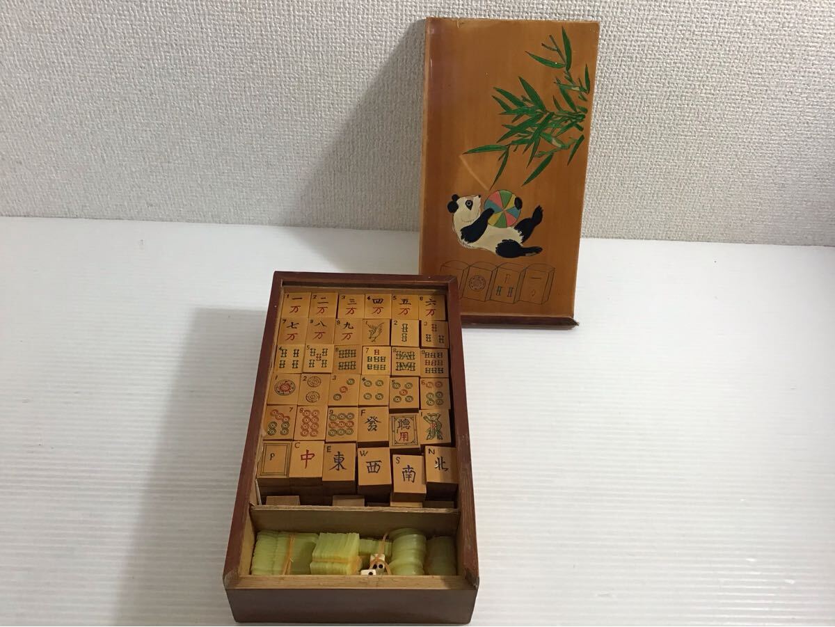 - 竹製 麻雀牌 中国 144枚 パンダ彫刻ケース マージャン 竹牌 古い アンティーク