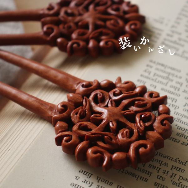 - 秋の装いSALE オリエンタル華輪文様木彫ウッドカービング 装い かんざし簪 天然 髪飾り着物 Q03