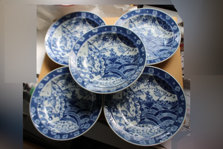 - ★ け-17 市田ひろみ 未使用 皿 5枚組 藍絵巻 箱なし 大きさ/約寸 単品)径21.5cm 高さ4cm 重さ400g 総重量2.1kg