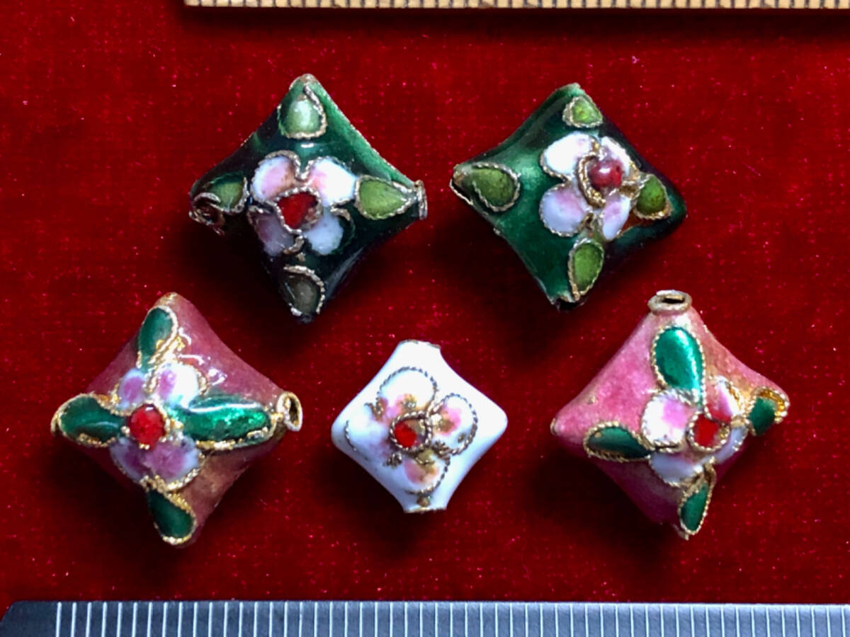 - ¶!¶ 有線七宝焼ワールド - 5個の菱型玉で1単位 ¶!¶ 約厚8(10)㎜×12(16)㎜ 金線三色釉ピンク花 手作り 手芸 工芸 インテリアペンダント