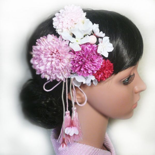 - 髪飾り 成人式 卒業式 結婚式 花 菊と桜房付 ピンク 振袖 袴 浴衣 和装 着物