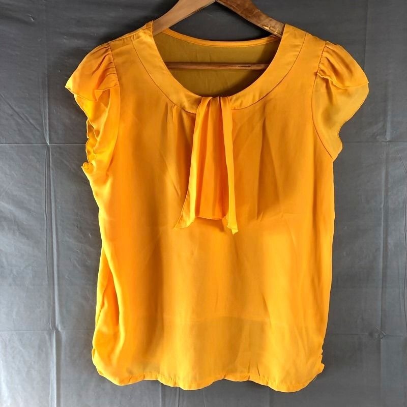 - ブラウス フレンチスリーブ リボンタイ ラウンドネック シフォン風 イエロー系 オレンジ系 Lサイズ 2025082800117