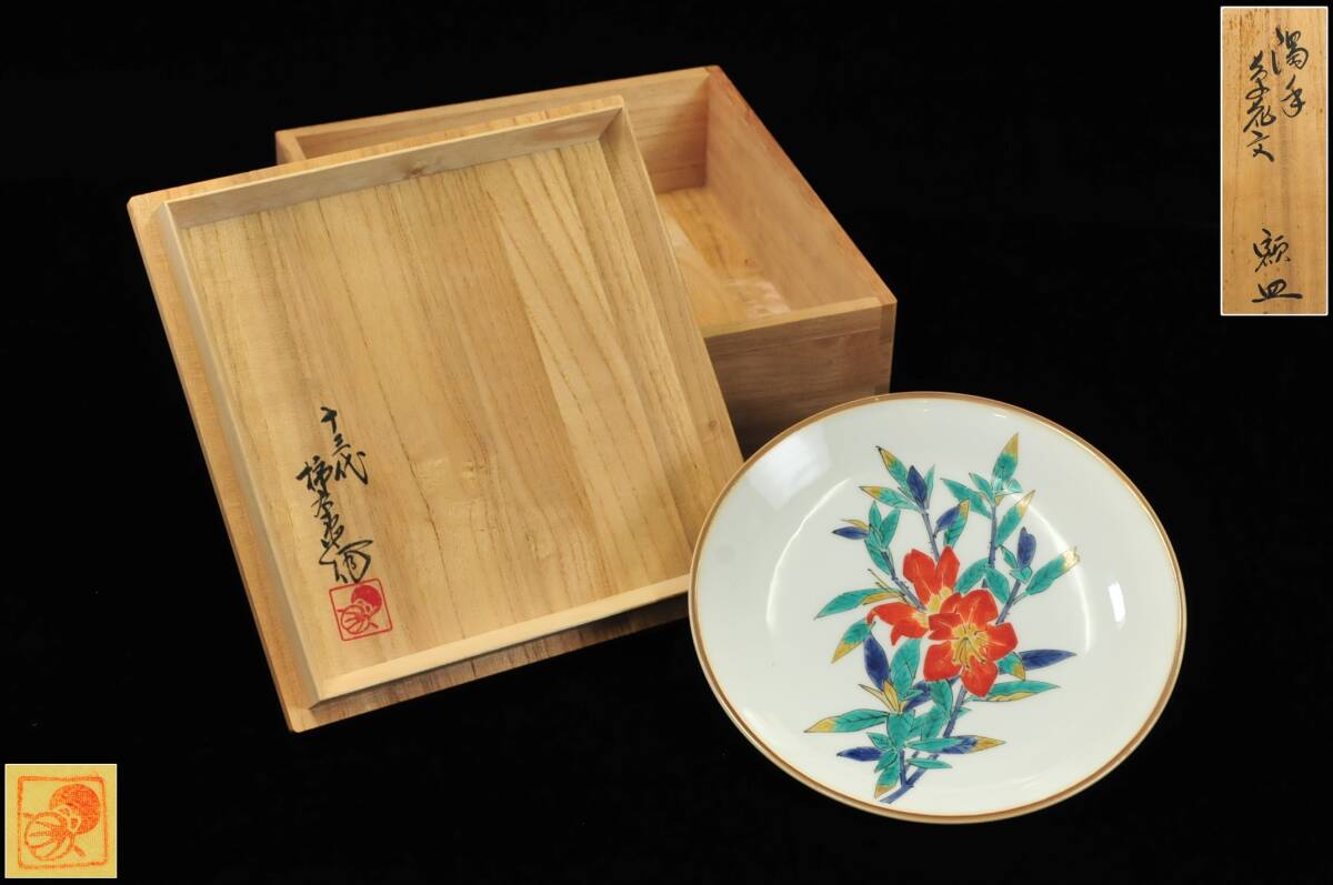> 【真作】 十三代 酒井田柿右衛門 濁手 草花紋 額皿 共布共箱 直径:約19cm 人間国宝 03109011-1