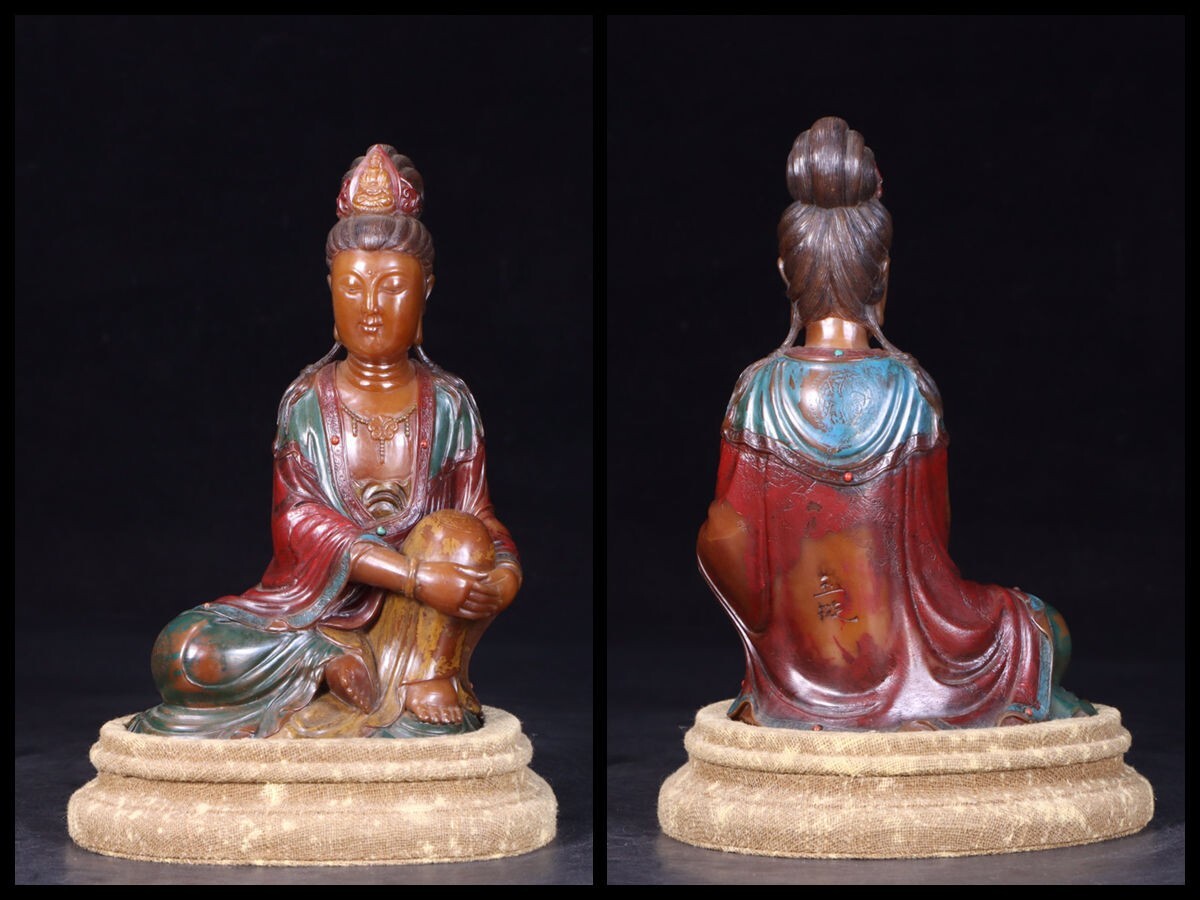 - 「清 玉セン 老寿山石 芙蓉石彫り 施鉱物彩 観音擺件」極細工 擺件 古賞物 中国古美術 旧蔵出