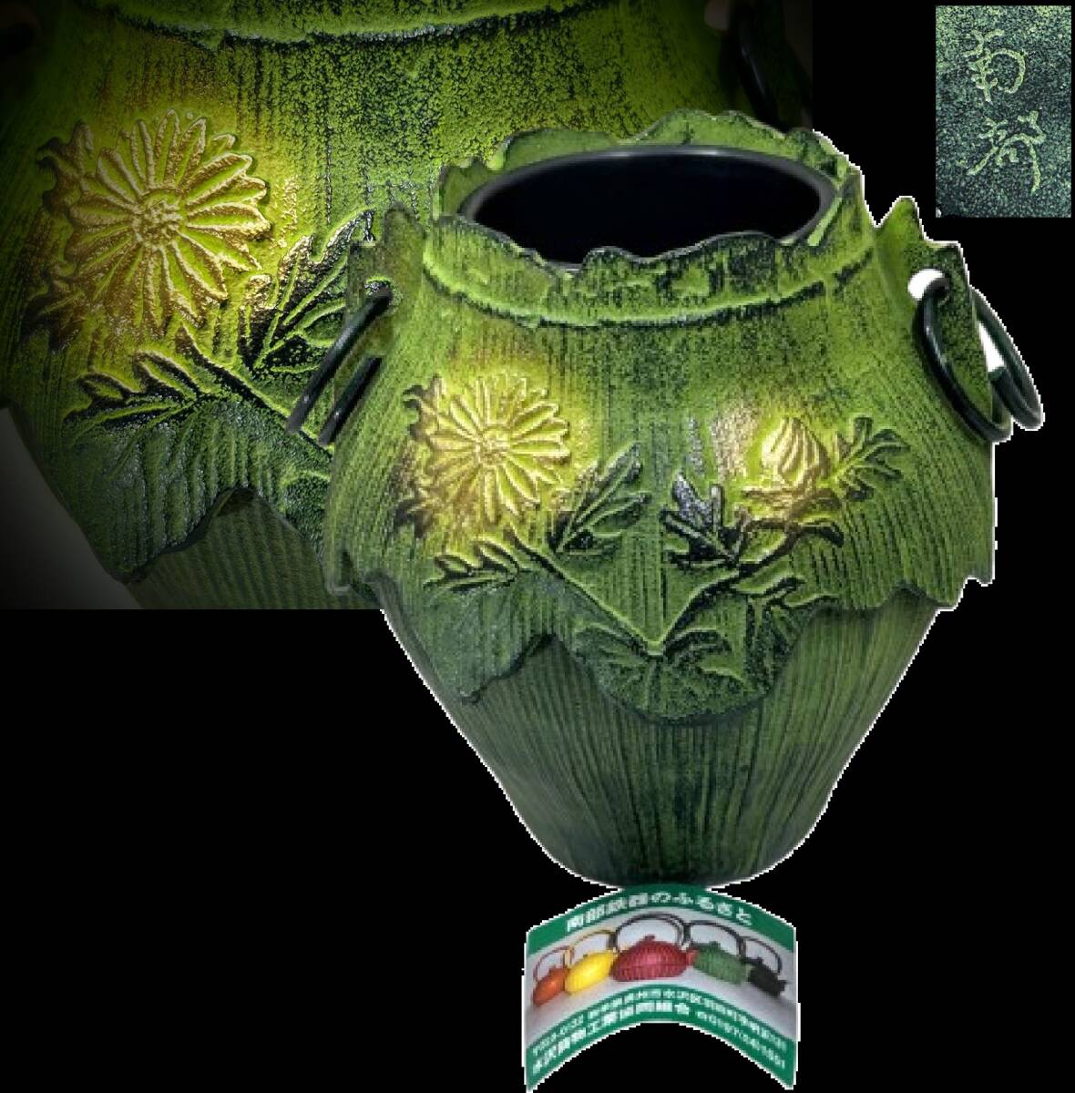 - 鋳物 南部鉄器 遊環取手 緑 金彩 菊花 浮彫紋 花器/花瓶/花生 オブジェ/置物 華道具 茶道具 金属工芸 used 箱無 未使用 経年保管品 古道具