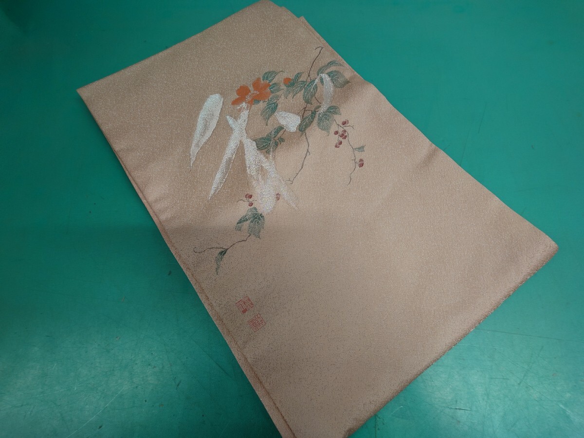 - ● 184 作家物 落款あり【和野花】【?蔵?門】 【紹圓】華 花 淡ペール オレンジ/ピンク 高級 六通 正絹 帯 縁起物 美品 ③