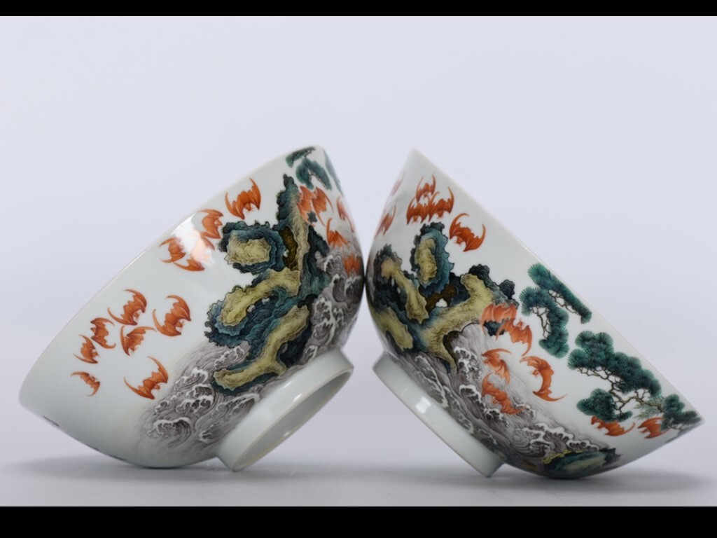 - YH165■清宮旧蔵■大清雍正年制・琺瑯彩福山壽海大碗一対 古玩 唐物 古陶磁器■高さ8.9cm直径18.7cm■