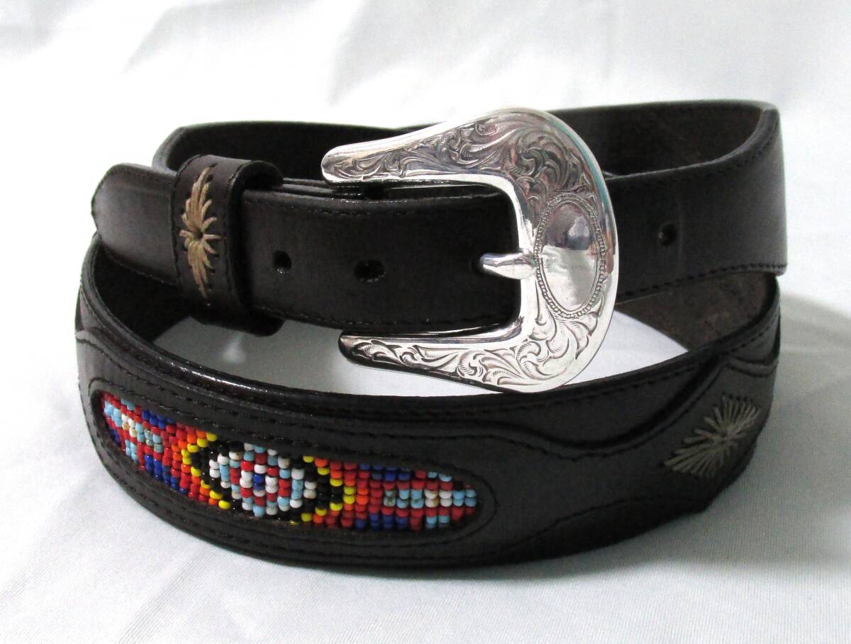 - 《美品》ウエスタンベルト 本革レザー ビーズ バックル ネイティブ系 インディアン系 ※クリーニングメンテナンス済み