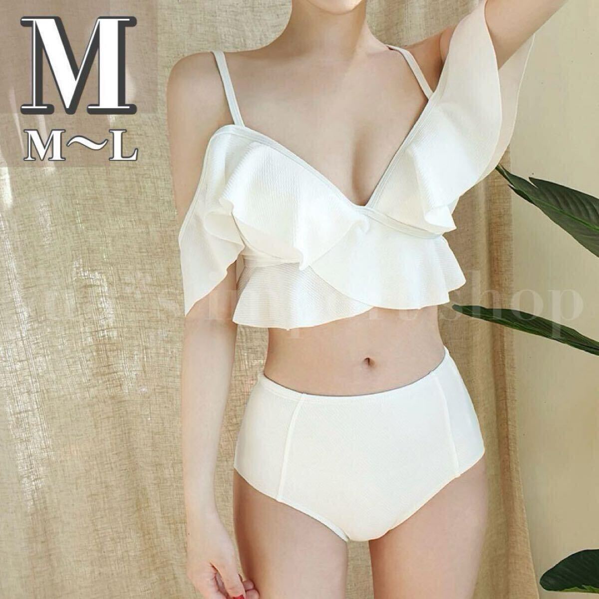 - 水着 レディース M ビキニ 白 清楚 フリル ハイウエスト オフショルダー リボン 可愛い 盛れる 細見え ビーチ プール