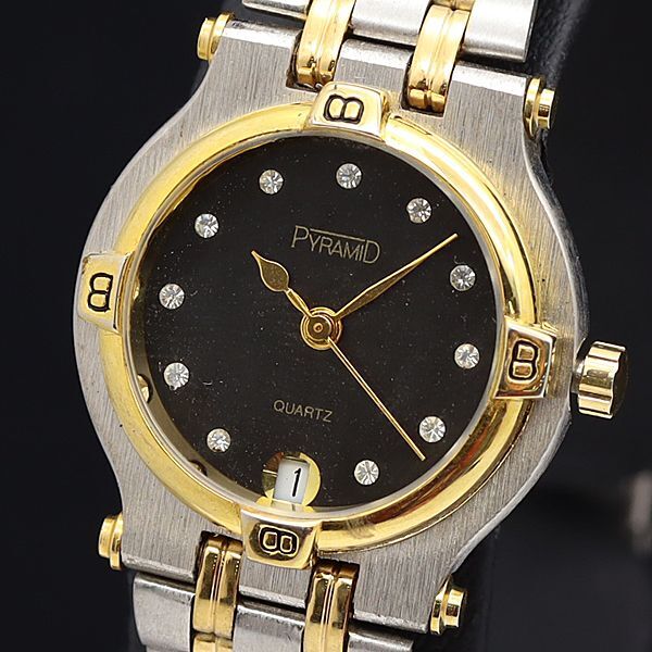 - ピラミッド QZ 黒文字盤 デイト 石付 レディース腕時計 OGI 2000000