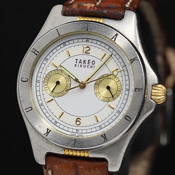 - 稼働 良品 タケオキクチ QZ TK-2002 白文字盤 黒文字盤 クロノグラフ ラウンド メンズ腕時計 TCY2000000 NSK