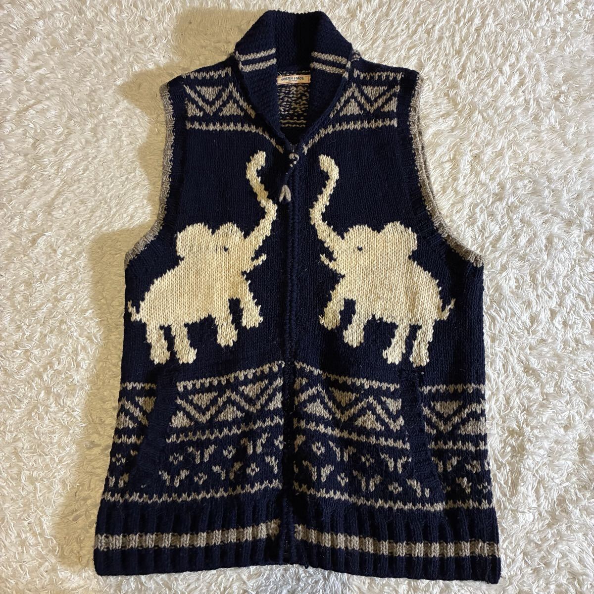 > 【美品・L相当】GAIJIN MADE ガイジンメイド エレファント柄 ニットベスト 象 ネイビー メンズ M ノルディック柄 アジアン ベスト ウール