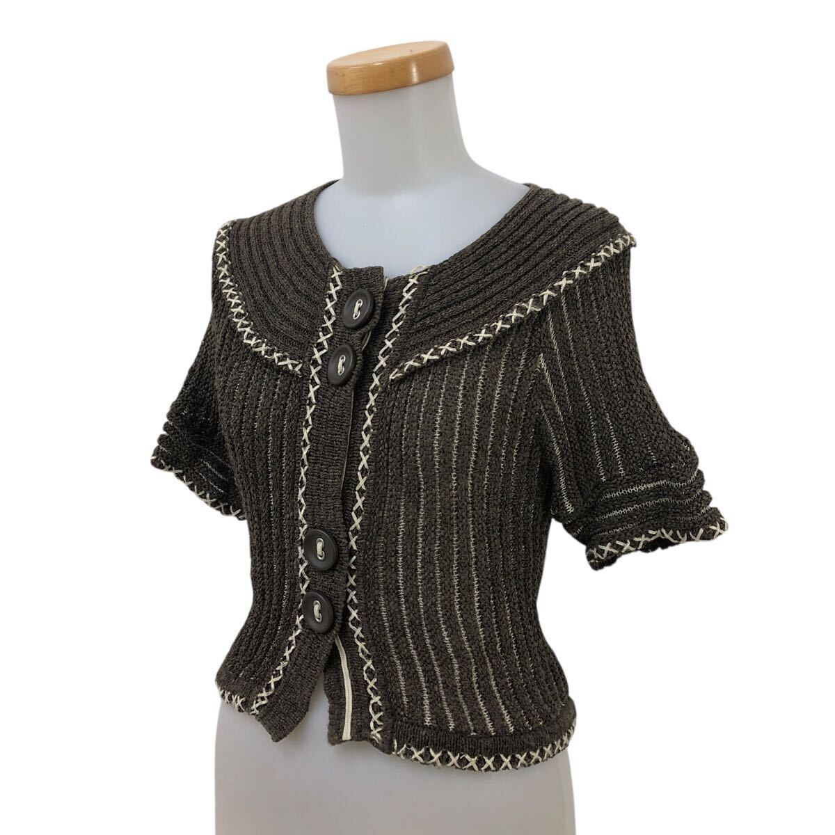 > 9NK002-46 HIROKO KOSHINO ヒロココシノ 編み込み 半袖 ニット カーディガン 羽織り 上着 ステッチ 茶系 レディース 女性用 38