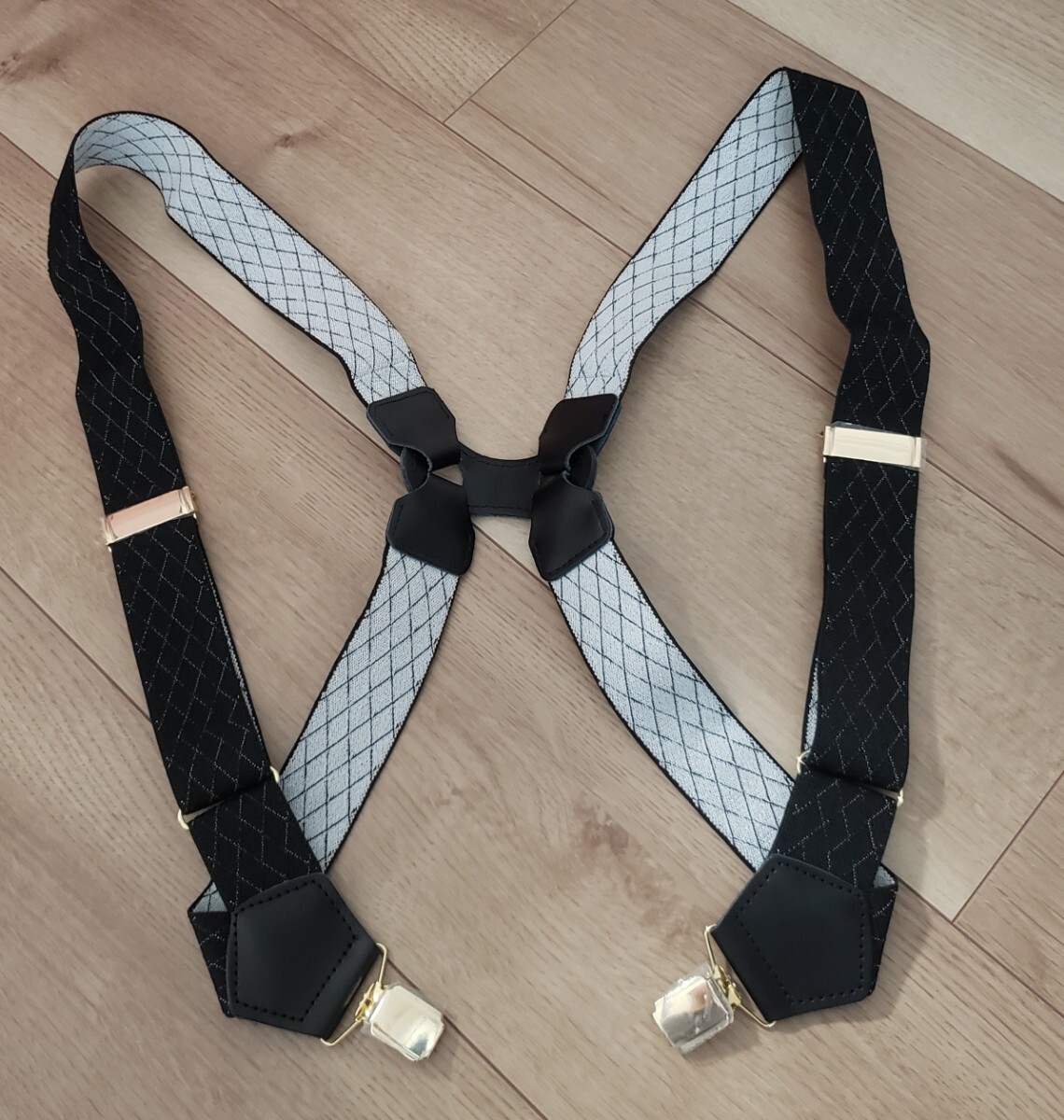 - 未使用 ホルスター型 メンズ サスペンダー ブラック 黒 ダイヤ柄 伸縮 ストレッチ 送料無料 裏側白 合皮 送料無料
