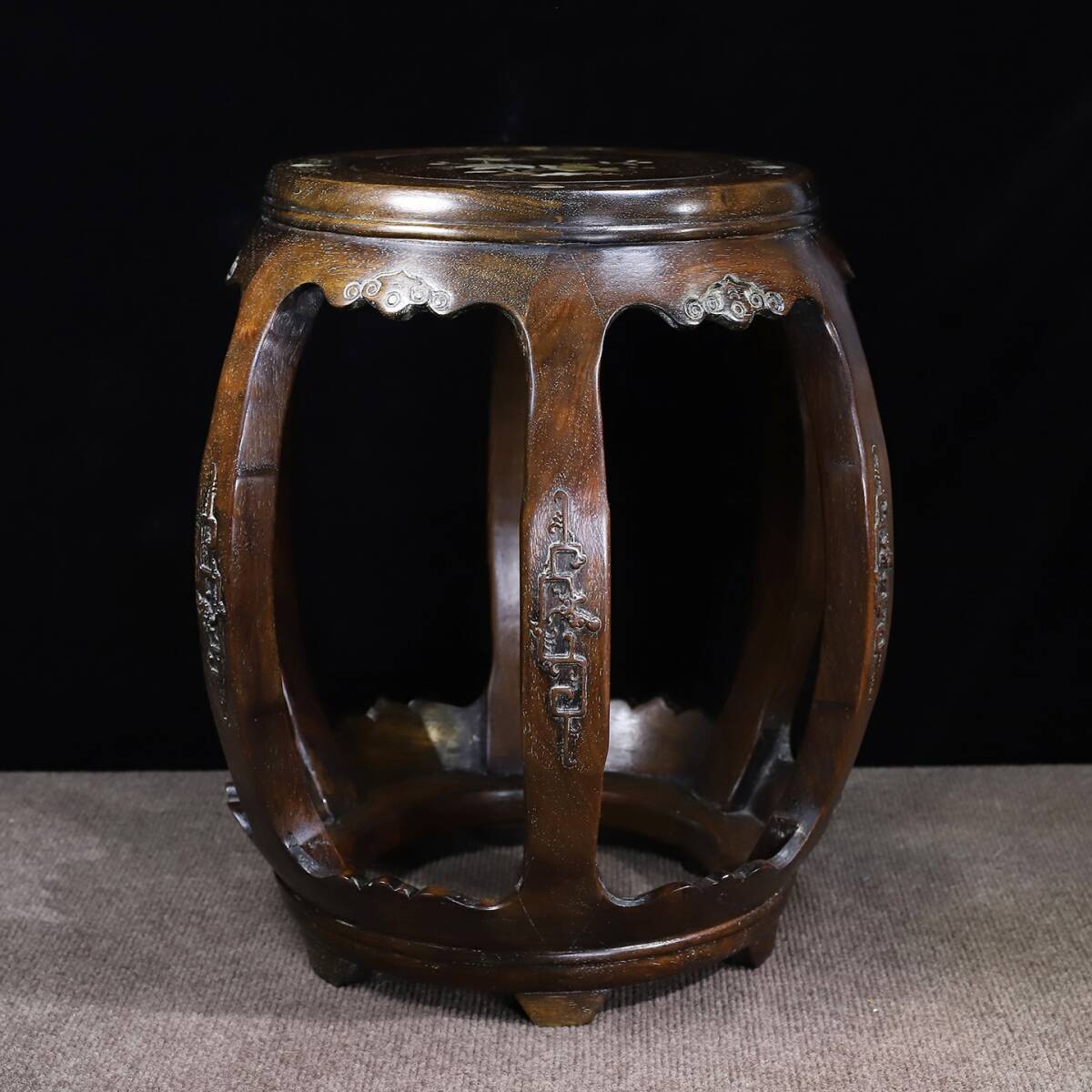 - 旧蔵 清 花梨木 はめ込む貝殼 鼓ベンチ台 圓ベンチ台 古箏ベンチ台 包漿醇厚 細膩温潤 木製 極細工 中国古玩 骨董品 古美味 209
