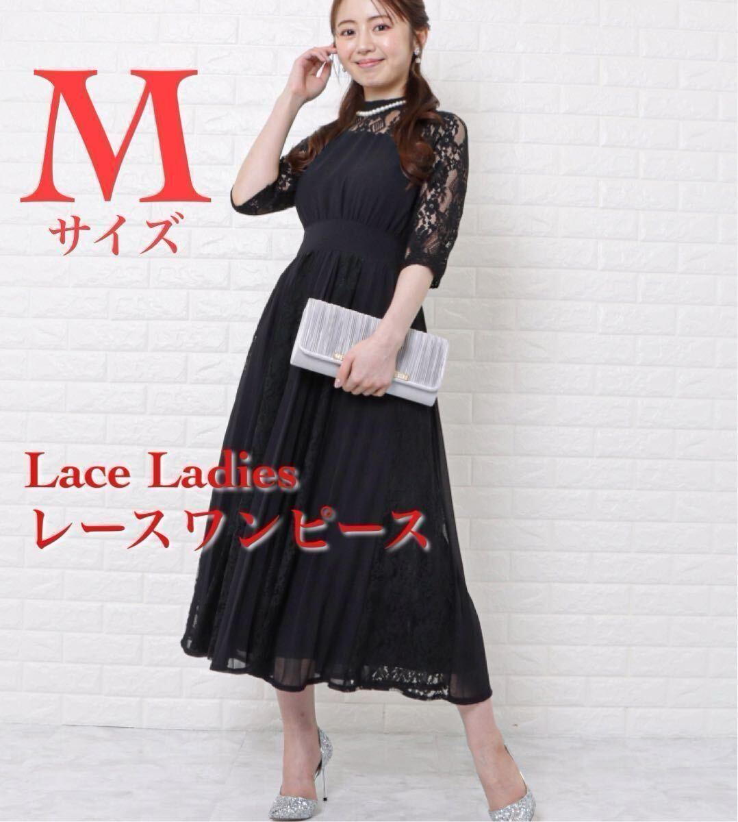- Lace Ladies 黒 ブラック レースワンピース七分袖ワンピース 結婚式 パーティー ロングフレア結婚式 カラードレス