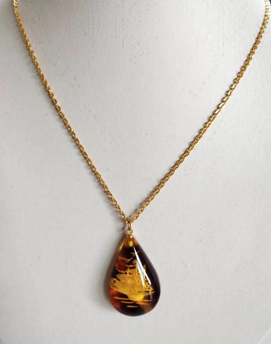 - べっ甲舟彫刻・ネックレスペンダント・ゴールドカラーチエーン