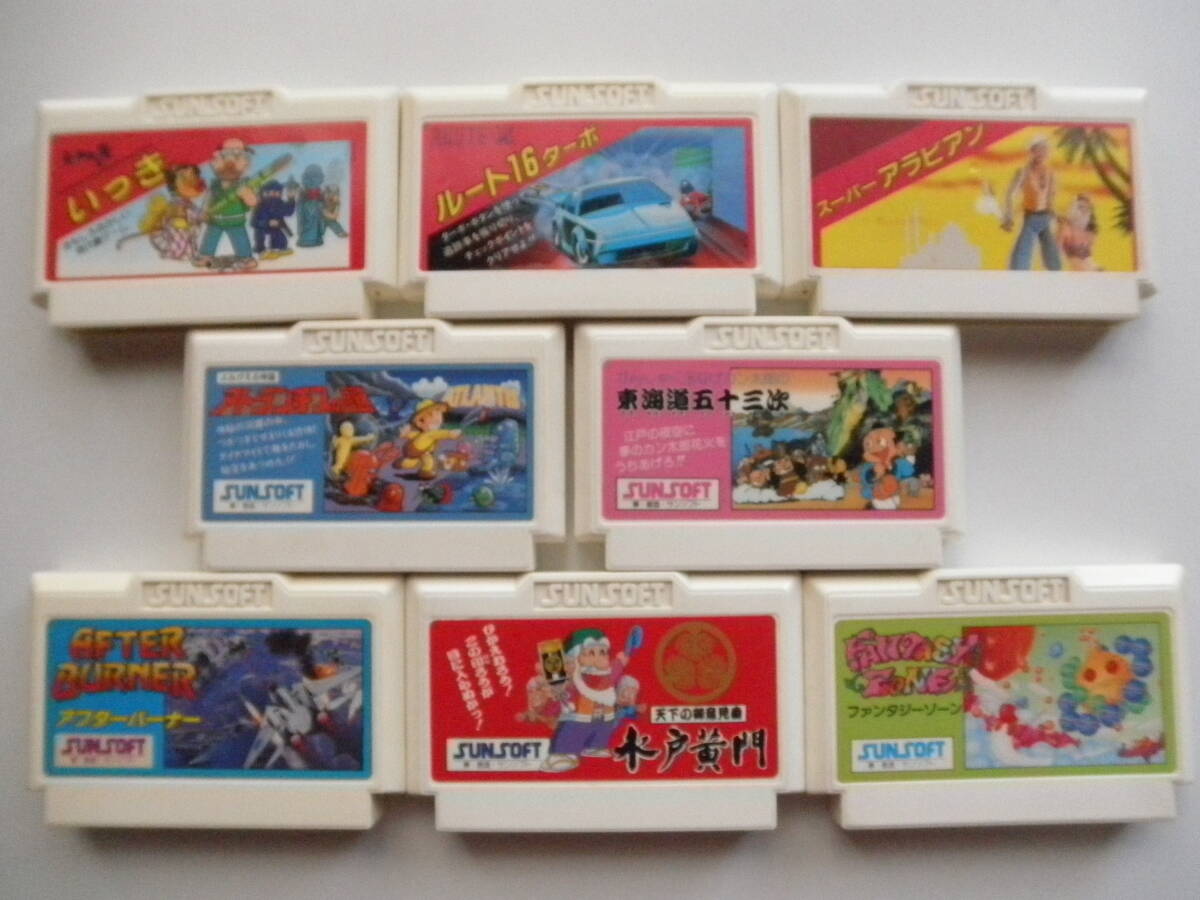 > ●FCソフトセット サンソフト8本(アラビアン、ルート16、アトランチス、東海道、ファン~ゾーン、水戸黄門、アフターバ) 初期起動確認済