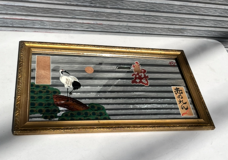 - SK07 昭和レトロ品 魚屋 鮮魚店 店頭 看板 額装 大入 縁起品 昭和 鶴に松 ガラス