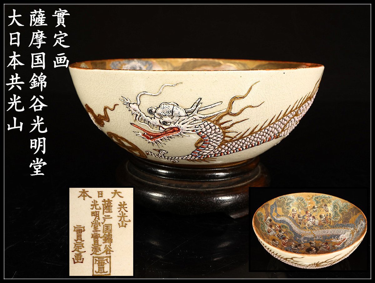 > 【吉】高CL719 明治時代 「大日本共光山薩摩国錦谷光明堂實定画」 本金彩羅漢龍紋 茶碗/本物保証品!