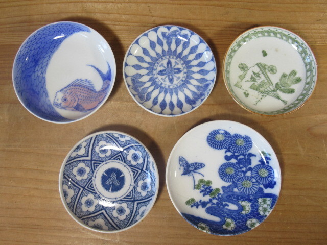 - ◆図変わり印判皿:6:◆5種5枚完品◆『鯛網:瓢箪:扇面:梅唐草:流水菊蝶』◆明治◆取り皿:小皿◆
