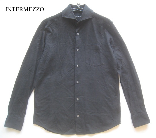 > 美品!!インターメッツォ INTERMEZZO*ストライプ柄ストレッチポリコットンワイドスプレッドカラーシャツ M 黒 ブラック D'URBAN ダーバン