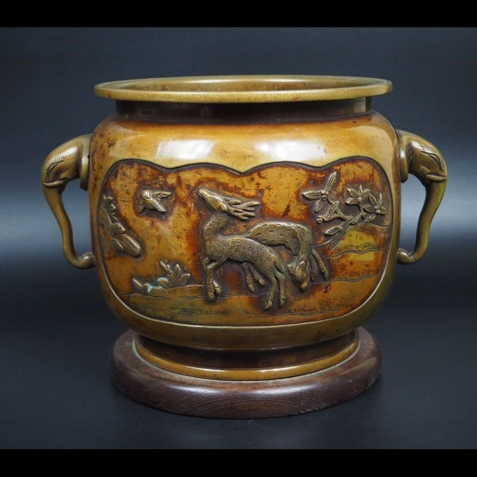 - 【金富士】高肉彫 江戸時代宣徳銅花鳥文彫刻火鉢 ②検/銀瓶鉄瓶茶托茶壺古錫玉川堂高岡佐渡銅器龍文堂亀文堂清