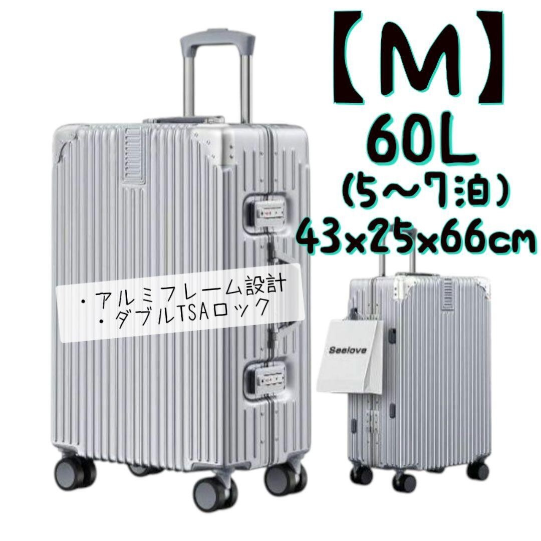 > スーツケース 【M】 5~7泊 60L シルバー ABS+PC 耐衝撃 大容量 超軽量 キャリー 360度回転 静音 TSAロック 出張 旅行 アルミフレーム