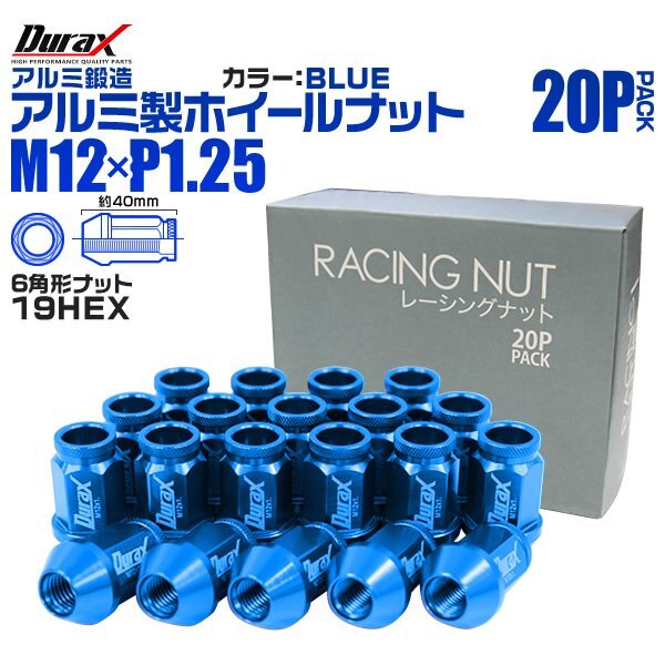 > Durax正規品 レーシングナット ラグナット ホイール M12 P1.25 ホイールナット 貫通 40mm 青 20個 日産 スバル スズキ