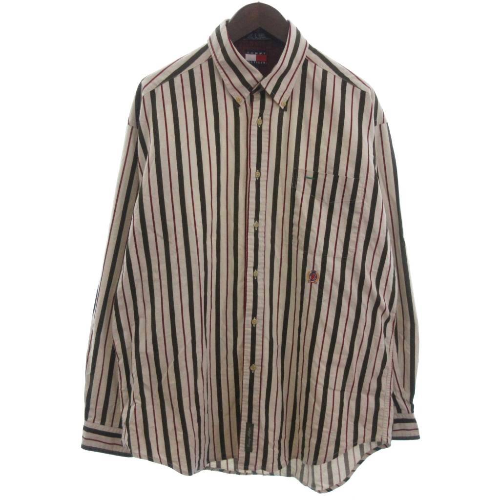 - トミーヒルフィガー TOMMY HILFIGER ボタンダウンシャツ 長袖 ストライプ 生成り カーキ ワインレッド系 L ☆AA★ ■GY99 メンズ