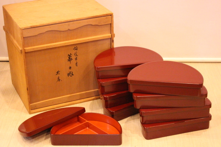 - d-7150 溜塗半月 幕の内 弁当箱 9客 共箱 木製漆器