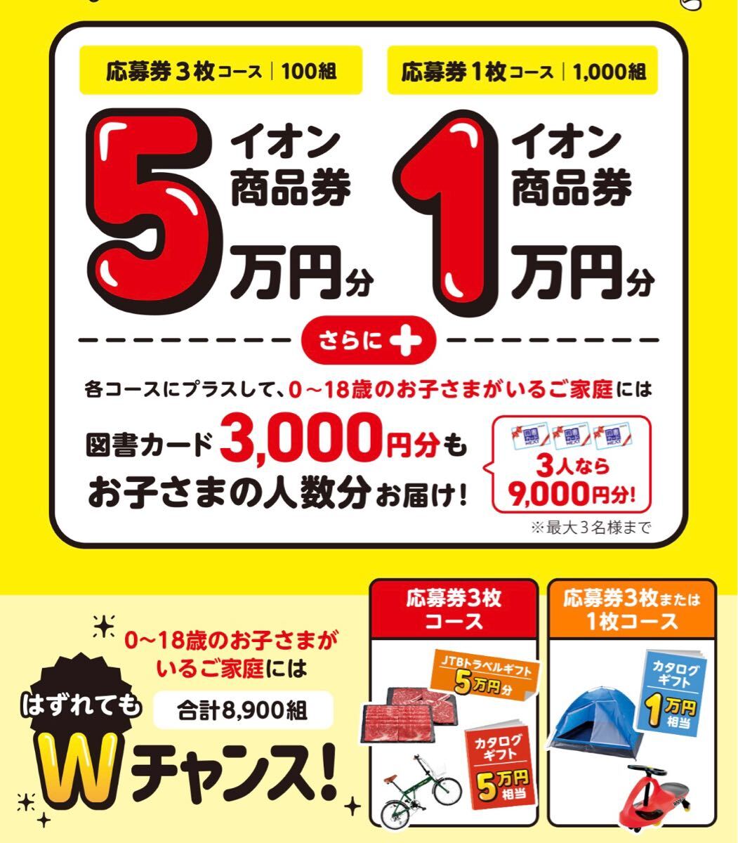 > 大量当選!懸賞応募★イオン商品券5万円分or1万円分が当たる★WチャンスでJTBトラベルギフト5万円・カタログギフト1万円・送料85円・WEB応募