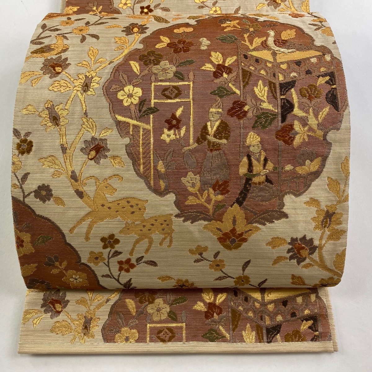 > 袋帯 美品 秀品 人物 花鳥 金糸 刺繍 薄茶色 六通 正絹 【中古】