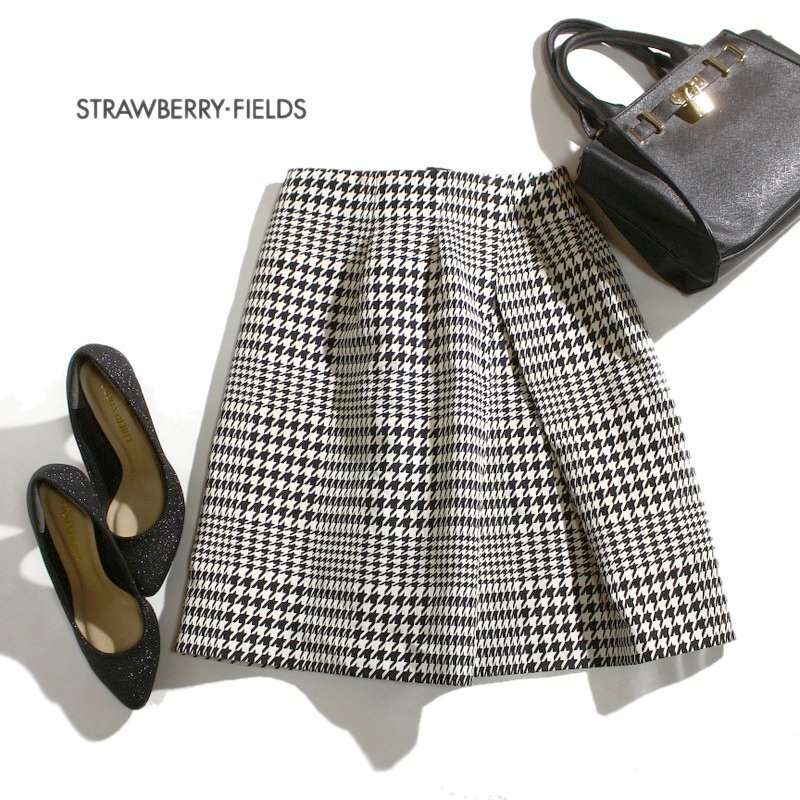- 美品 ストロベリーフィールズ STRAWBERRY-FIELDS ハリ 艶 千鳥柄 上品 タック フレアスカート 2 ブラック 黒 ホワイト 白 タフタ 通年 合物