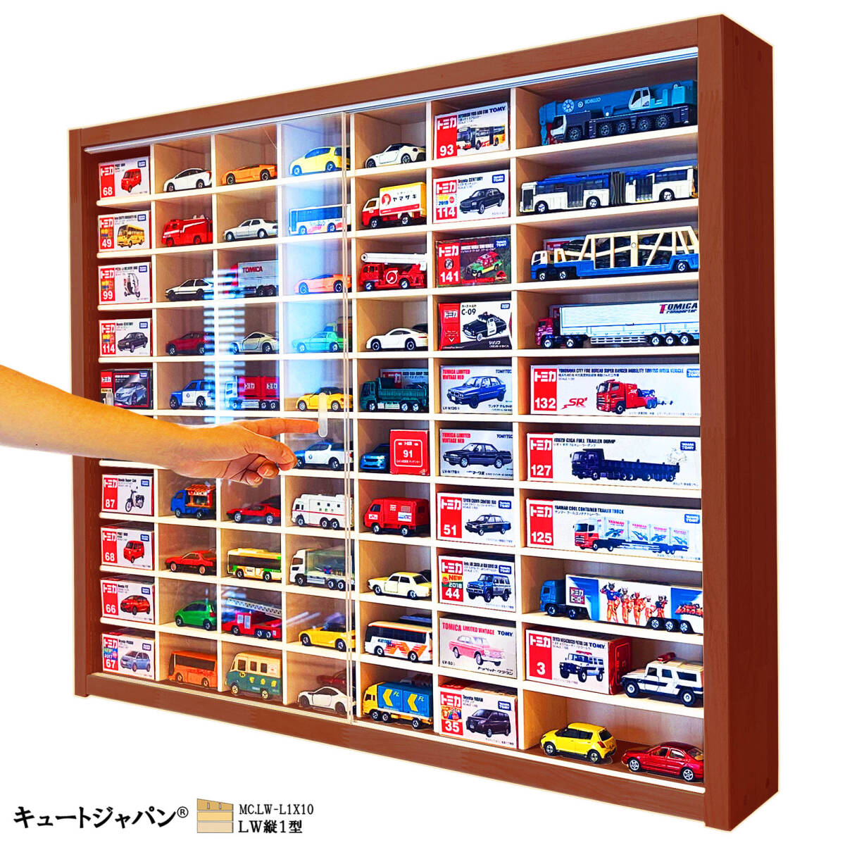 - 送料無料★【ショーケース】アクリル障子付 ミニカーケース トミカ120台 ロングトミカ20台収納 マホガニ色塗装 日本製