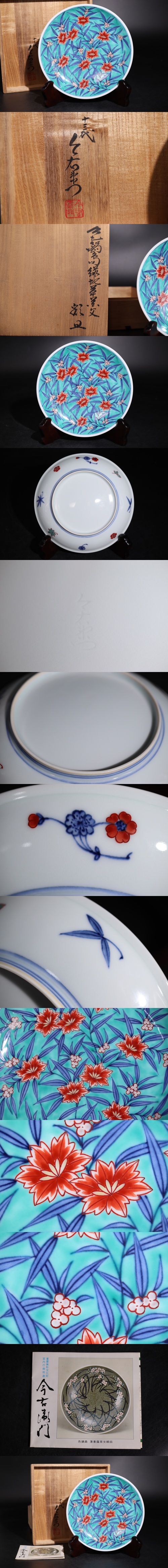 - 十三代 今泉今右衛門 本人作 「 色鍋島 緑地 草花文 額皿 」 栞・台座・共箱付 / 人間国宝 皿 茶器 煎茶道具 .G2617
