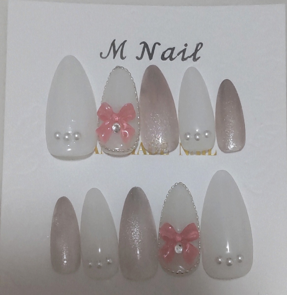 - ホワイトスノー リボンネイルチップ#ネイルチップ#ガーリー #スナ系 #韓国#マグネット#ワンホン#キラキラ