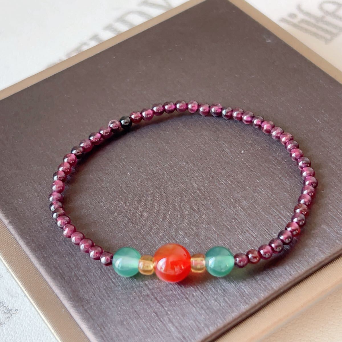 > ◇ガーネット(柘榴石)+赤瑪瑙+緑瑪瑙 ◇小粒◇ブレスレット◇パワーストーン◇天然石◇巾着袋付き◇プレゼントにも 031B92102