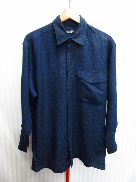 - クリスチャンディオール ムッシュ 90sヴィンテージ 総柄シルクシャツ メンズM 紺 絹シャツ 襟付き長袖カットソー ウールシャツ 09183