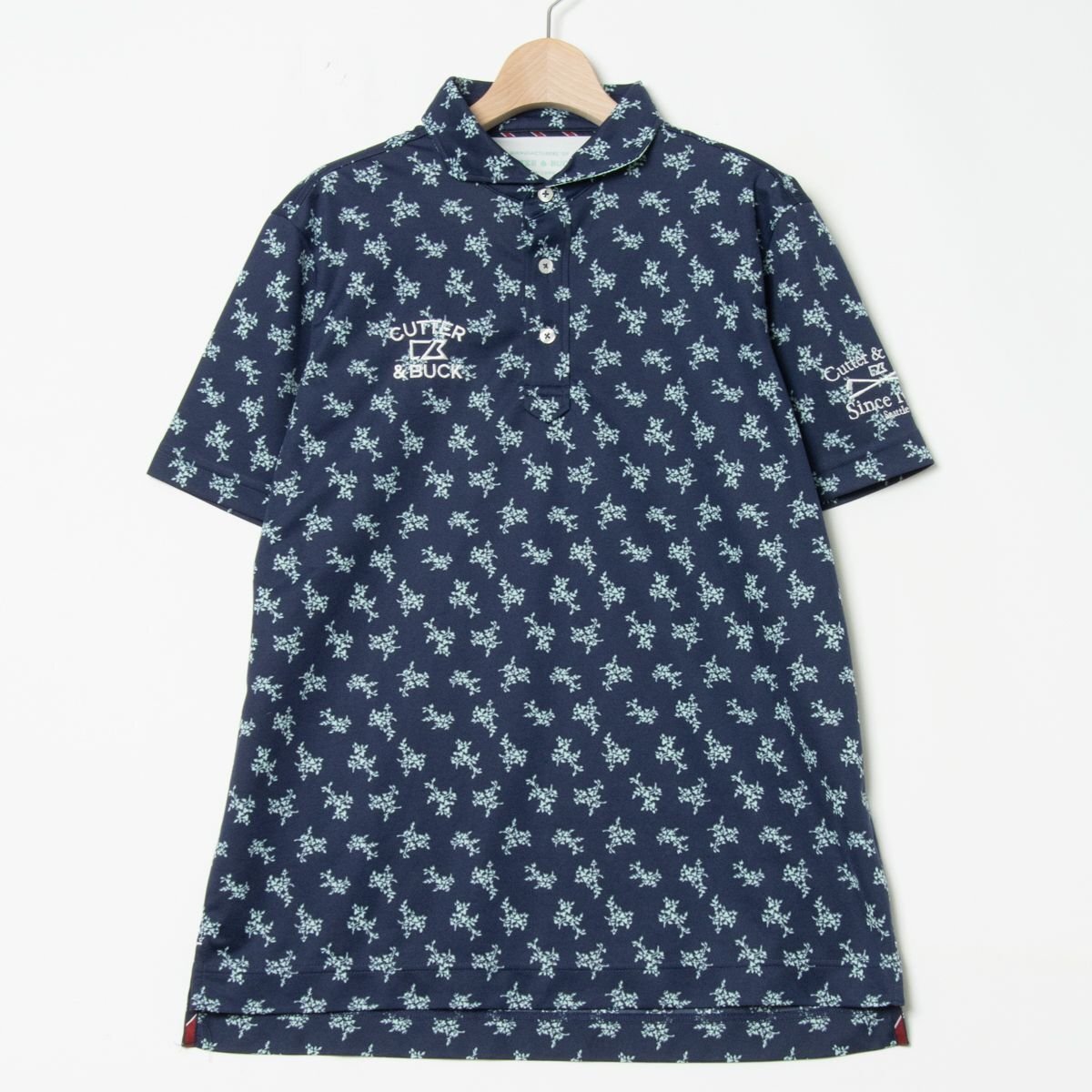 > メール便◯ CUTTER&BUCK カッターアンドバック 総柄ジャージ素材半袖シャツ ゴルフウェア ロゴ刺繍 ネイビー 紺 L メンズ 紳士 デサント