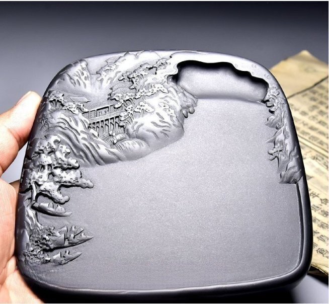 - 特売!佳品 無形文化遺産 歙硯 原石 《漁と歌の夜硯》(長さ14.0*幅13.0*高さ2.3cm)純手作り雕刻 天然 原石 佳品 收藏 書道 老坑 硯
