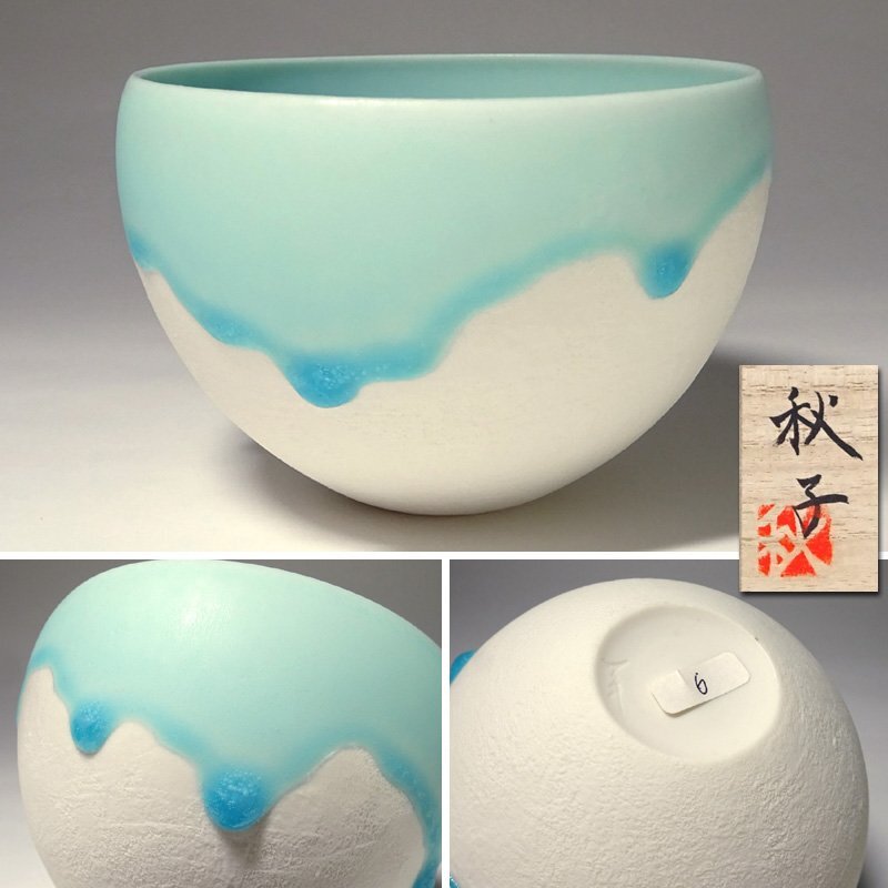 - 慶應◆日本工芸会正会員【冨川秋子】作 茶碗「微睡―氷青―」日本橋三越個展出品作品 共箱付