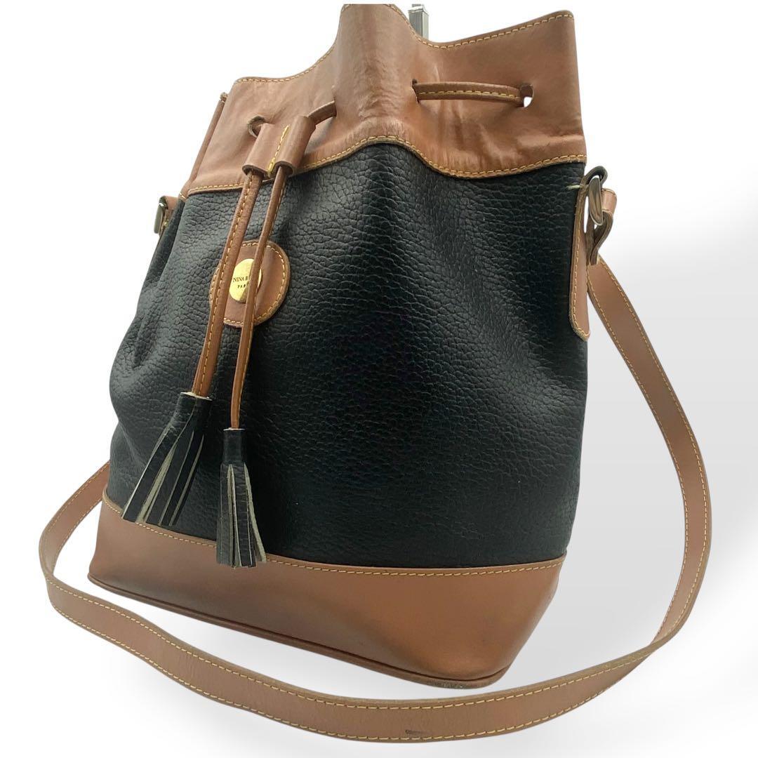 - 良品 ニナリッチ ショルダーバッグ 巾着 レザー リボン 斜め掛け 金具 黒