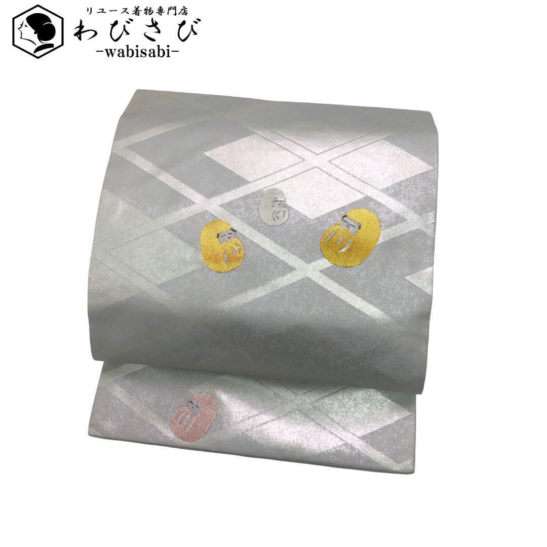 > 名古屋帯 菱形に可愛らしい達磨柄 金銀糸 灰色 O-4402 着物 きもの kimono 和服 和装 中古 リサイクル着物 【送料無料】