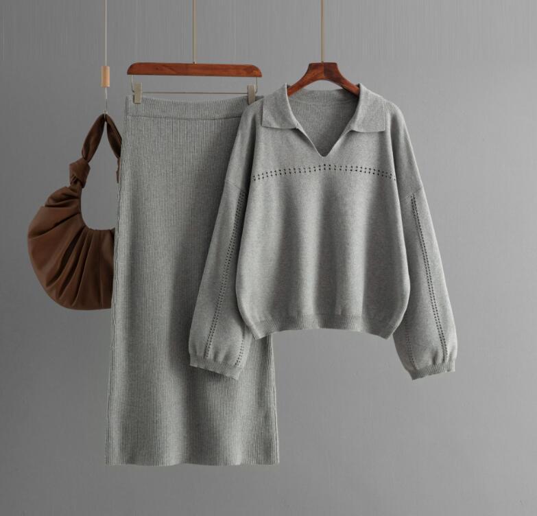 - 346 スカートスーツladiesレディース ◇ 秋冬 上質 ◇ 暖かい 厚手 ニット素材 グレー