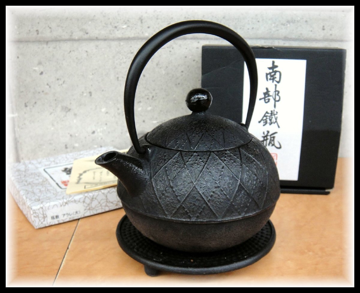 > 9403S 南部 鉄器 及春鋳造所 鉄瓶 アーガイル 黒 0.6L 五徳付 寸法W12×D16×H11cm 弦までの高さ16cm 直火OK 鉄急須 茶道具 茶器 岩手県