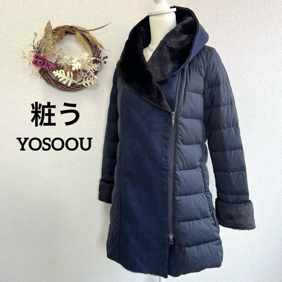 > ☆超美品☆ YOSOOU 粧う ヨソオウ ダウンコート ミドル丈 フェイクスエード・ムートン 上品 高級 マダム ネイビー 紺 M