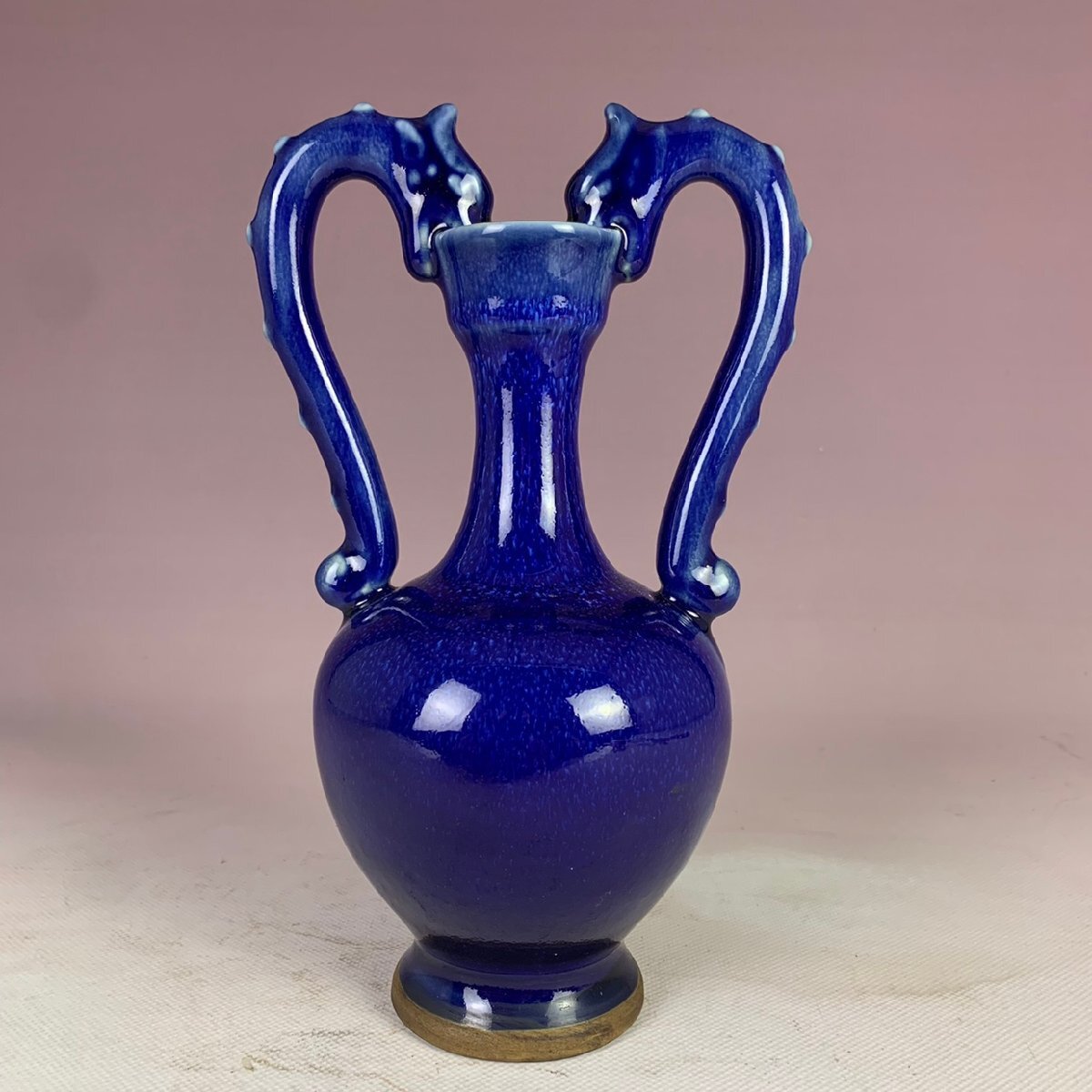 - 景徳鎮 磁器 藍釉 陶磁器 窯変 花瓶 双耳龍頭花瓶 置物 収蔵 コレクション ZH340